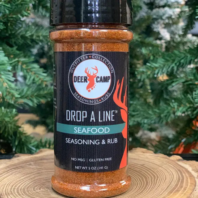 DEER CAMP® Drop A Line™ Seafood Seasoning & Rub is a blend of bold spices, garlic, lemon and smoke flavor. No salt and tastes the entire camp will enjoy.